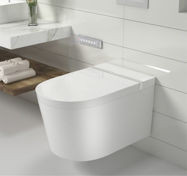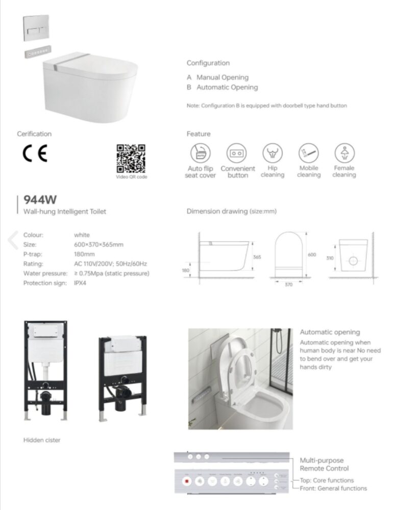 Experience a new level of comfort and innovation with the 944W Smart Wall-Hung Intelligent Toilet. Designed with sleek, modern aesthetics and advanced functionality, this intelligent toilet brings luxury and hygiene together in perfect harmony. Enjoy effortless convenience with automatic lid opening, hands-free operation, and a multi-purpose remote control for complete comfort management. Featuring customized cleaning options for hip, mobile, and female hygiene, the 944W ensures a refreshing and personalized experience every time. The hidden cistern design creates a clean, minimalist look that complements any modern bathroom, while high-efficiency water usage and durable construction guarantee lasting performance. Key Features: Automatic or manual lid opening options Intelligent cleaning functions: hip, mobile, and female wash modes Sleek wall-hung design with concealed cistern for a modern aesthetic Convenient button and remote control for effortless use IPX4 water protection and energy-efficient performance Transform your bathroom into a sanctuary of innovation, cleanliness, and comfort with the 944W Intelligent Toilet — where smart design meets everyday luxury. Errors & Omissions Excepted (E&EO