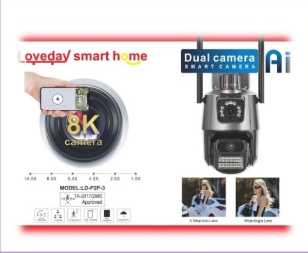 Introducing the Loveday Smart Home Dual Camera, the ultimate solution for comprehensive home security. This advanced AI-powered camera features a revolutionary dual-lens system, combining an 8K telephoto lens with a wide-angle lens to capture every detail with stunning clarity. Monitor your property with confidence, knowing you have both a broad overview and the ability to zoom in on specific areas. With smart features and a sleek design, the Loveday Dual Camera is the perfect addition to any modern smart home, providing peace of mind and unparalleled surveillance capabilities.