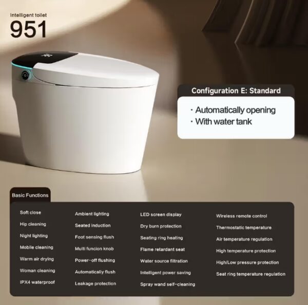 Experience the future of hygiene and comfort with the intelligent smart toilet Easy to connect no need for specialized equipment or plumbers you can DIY and tankless This smart Toilet features: Self-Cleaning Technology: -Warm Air drying -Bidet Functionality: Integrated bidet features allow for adjustable water temperature, pressure, and nozzle position for personal hygiene. -Soft Close the lid. -Foot Sensing Flushing -Night Light: A gentle night light can assist in nighttime use without turning on harsh bathroom lights. -Water Efficiency: Smart toilets are designed to use less water per flush while still maintaining effective flushing power.