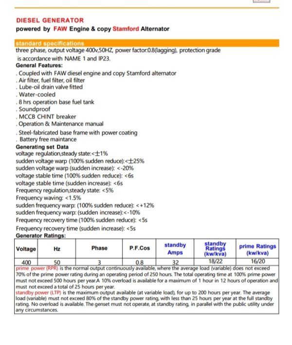 Introducing the SIMZ POWER VG20 Diesel Generator, a cutting-edge power solution designed to meet the demands of both commercial and residential applications. Equipped with a powerful FAW engine and a robust Stamford alternator, this generator guarantees a reliable power supply and exceptional efficiency.